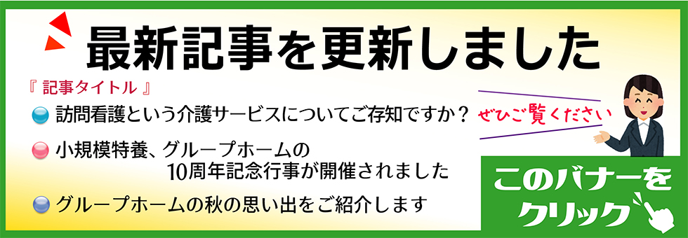 ”訪問看護という介護サービスについてご存知ですか?”を公開しました。”小規模特養、グループホームの10周年記念行事が開催されました”を公開しました。”グループホームの秋の思い出をご紹介します”を公開しました。