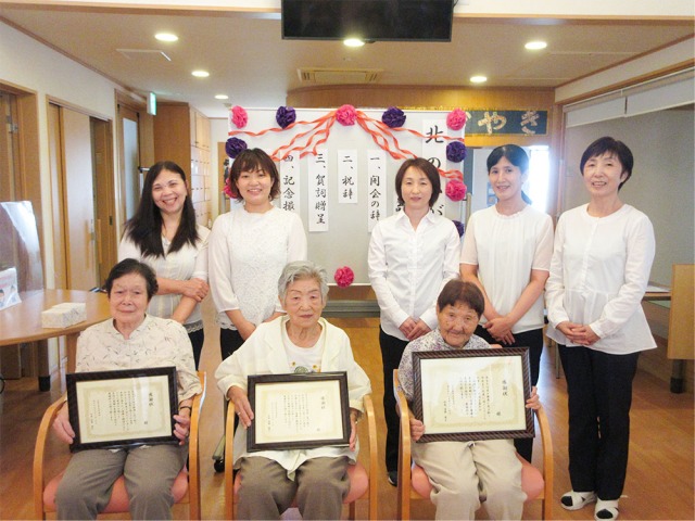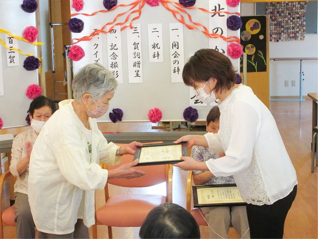 敬老会では、北のかがやき最高齢となる103歳の方をはじめ、白寿1名、米寿1名、喜寿1名の4名の方に感謝状を贈呈し、職員とご利用者の皆様でご長寿のお祝いをしました。