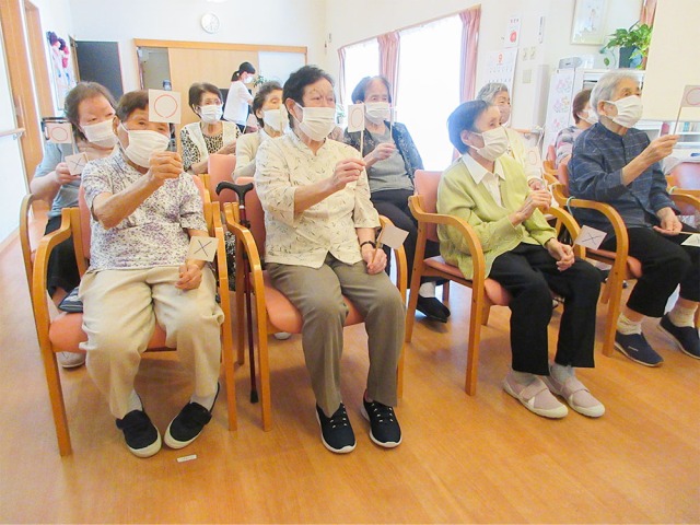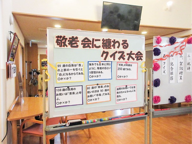 賀詞贈呈式の後は、敬老会にまつわる〇×クイズ大会です。賀詞贈呈式では緊張気味だったご利用者も表情が穏やかになり、クイズに夢中です。