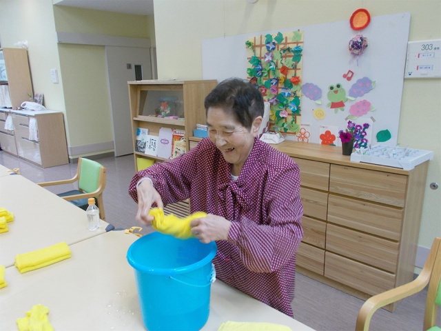 濡れタオルを作っています。食後のテーブル拭きもきれいにしてくれています。
