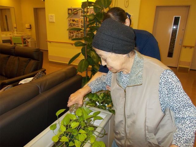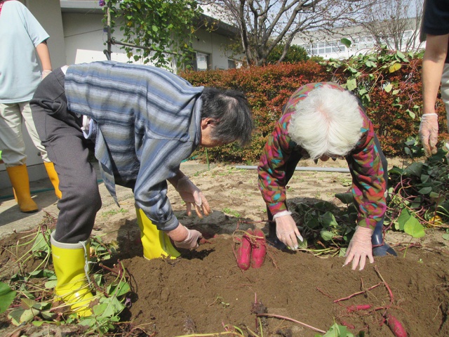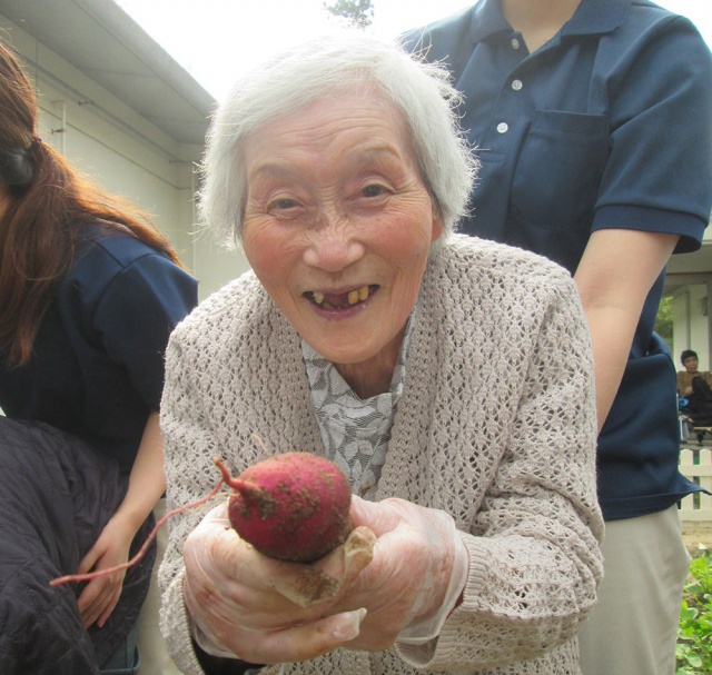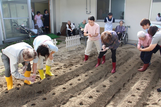 畑仕事に馴染みのある方がとても多く、指導していただきながら若いスタッフも一緒に植えました。毎日成長を眺めては、収穫を楽しみにしています。ご利用者より「畑仕事はまだまだ出来るのに、自宅では”危ないから”となかなかさせてもらえない。ここに来て楽しみたい。」と話され、世代間の交流の場、ご利用者本人の生活の活性化にも繋がっています。