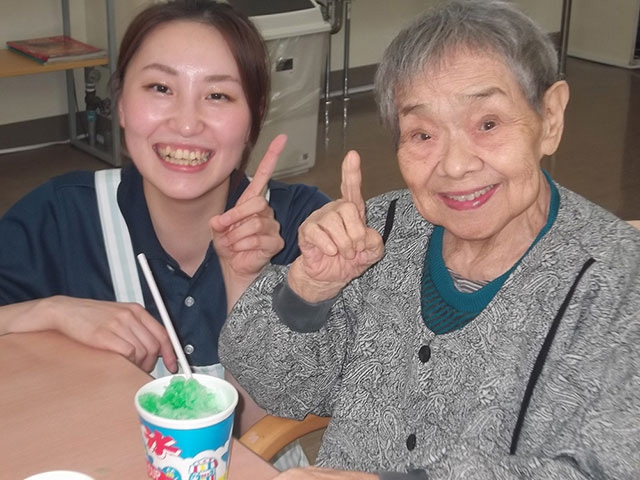 特別養護老人ホーム、グループホーム、ショートステイ、デイサービスのご利用者が会場に集まり、食欲をそそる匂いと祭りの賑やかな雰囲気の中、楽しみにしていた売店の前に行き、ご自分で食べたいものを選んで美味しく召し上がられました。