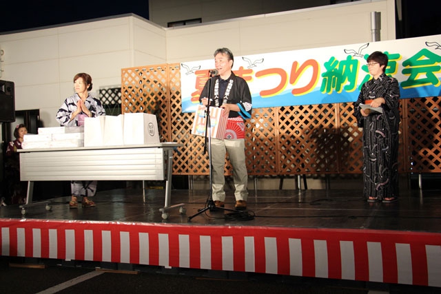 抽選くじを引くのは石澤施設長、景品の贈呈は池田理事長です。