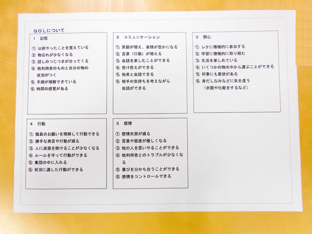 検査数値が低下しても、『血圧などの数値が安定している』『自分で食事を食べることができる』『服を着替えることができる』などの身体機能(ADL)や、『笑顔が増え、表情が豊かになる』『自分でしようという意欲が増えた』『レクリエーションや学習に積極的に取り組まれる』など生活の質(QOL)が上昇している方もいることを踏まえ、ご家族にご利用者の保たれているところをより分かりやすくお伝えするために、作成し実施しているのが『日常生活動作を評価する仕組み』です。