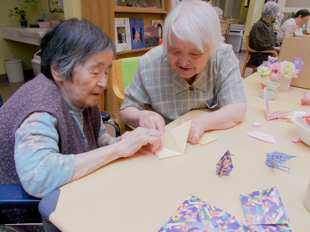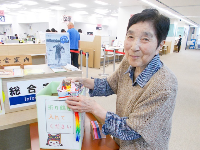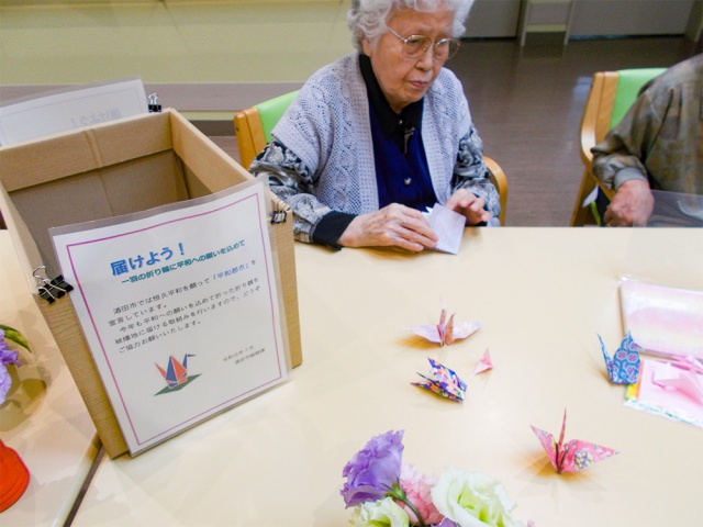実際に、募集されていた広報誌とポスターを掲示して、多くのご利用者と職員が平和に願いを込めて被爆地へ届ける鶴を折ることができました。