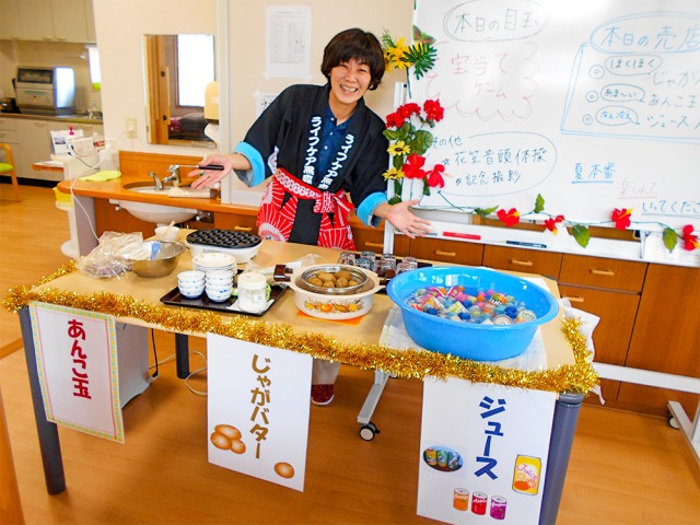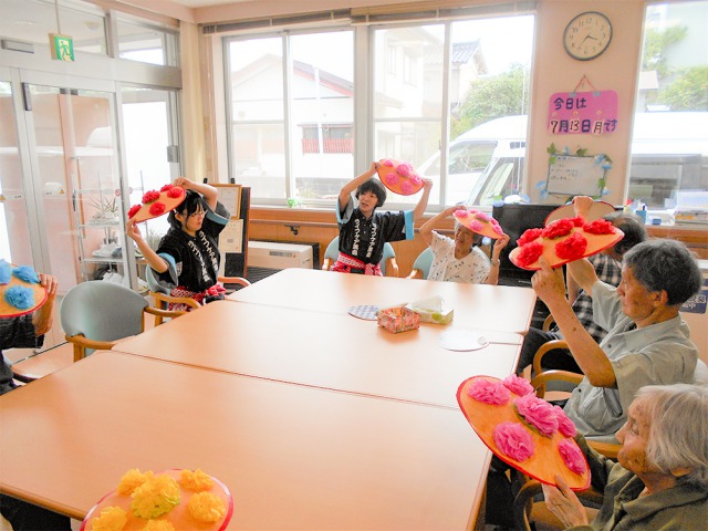 宝釣りゲームでは扇子や帽子など夏らしいアイテムをゲットして頂き、花笠音頭に合わせた体操を行ってから記念に集合写真を撮り、大盛況のうちに幕を閉じました。