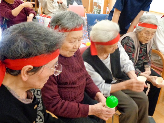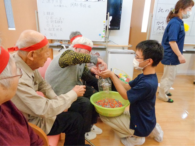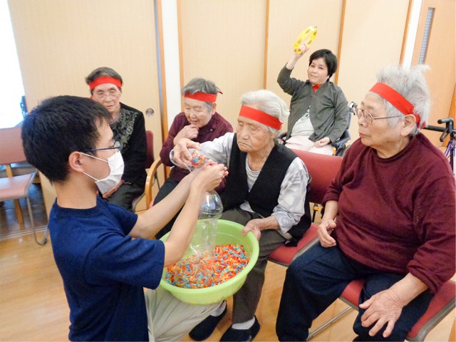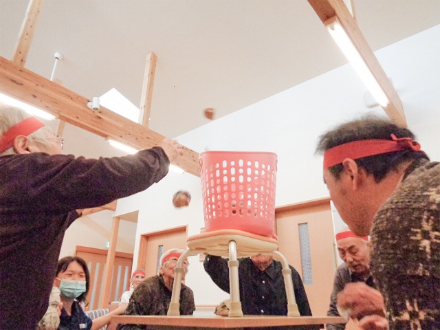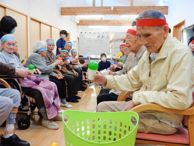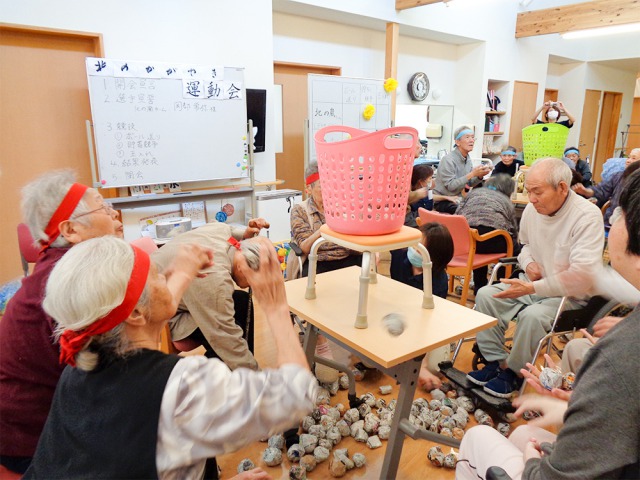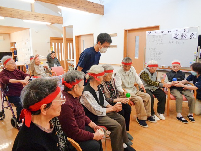 当日は、デイサービスチームと小規模多機能チームに分かれて、選手宣誓から応援合戦、ボール送り、貯蓄競争や玉入れなど白熱した競技が繰り広げられました。