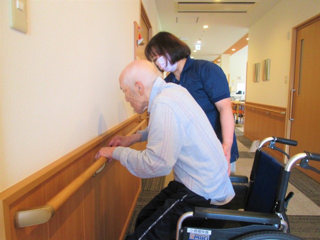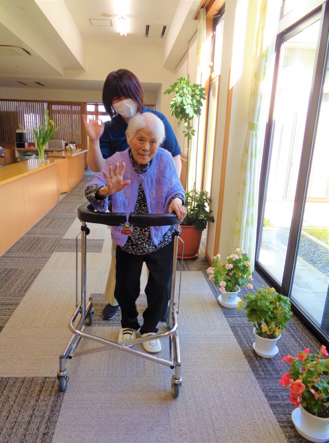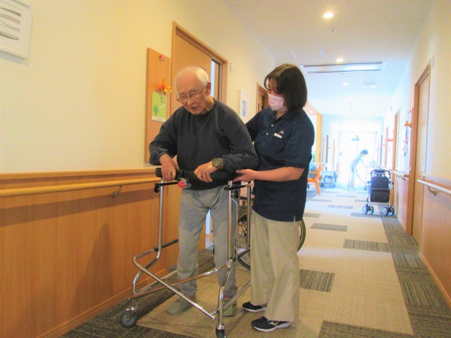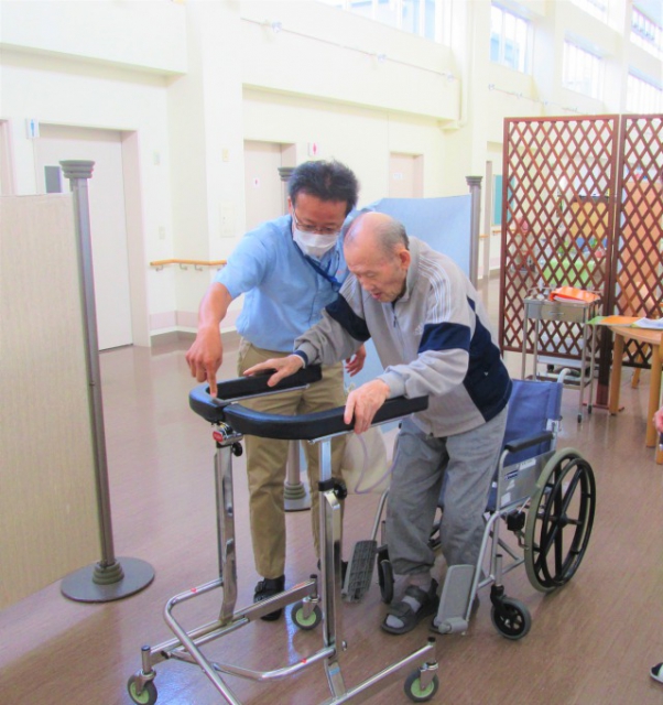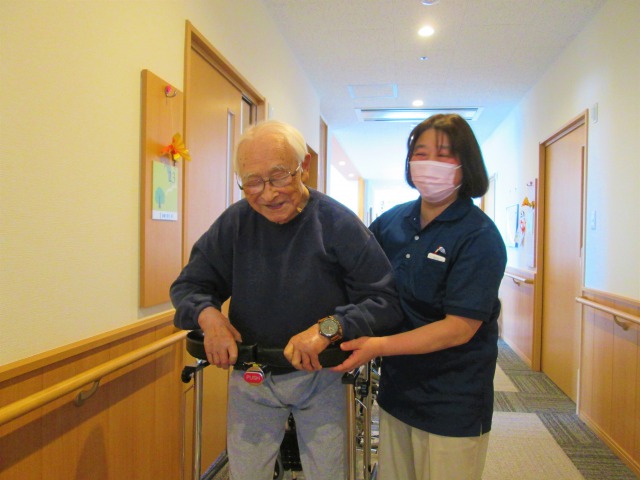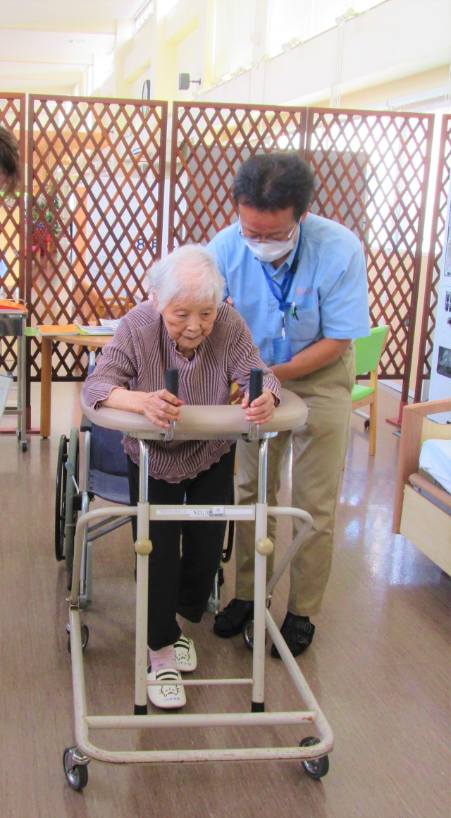 入所当初、車椅子に座って、足で漕いでの移動が、今では歩けるという自信と筋力がついてきて、歩行器を使用し介助付きで75mも歩くことが出来ました。