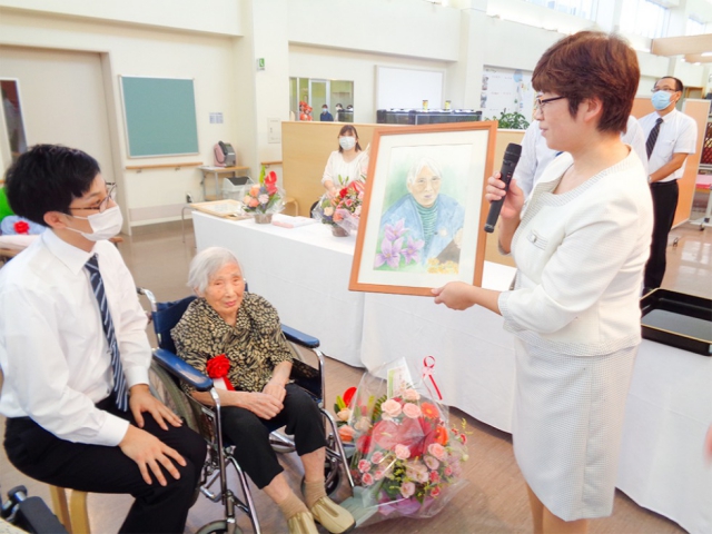 行事の中でも、敬老会行事においては山形県と酒田市から長寿のお祝いの賀詞を受け、施設内で賀詞伝達式をいたしました。また、職員が最高齢Aさんの肖像画を描いてサプライズでお祝いをした最高の思い出があります。