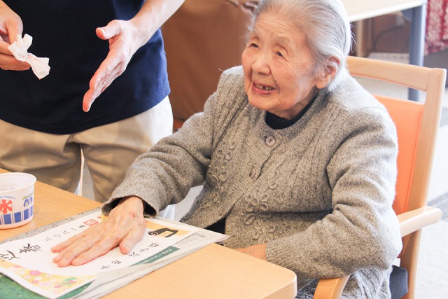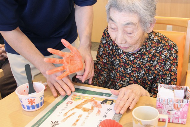 書初めは、年の初めに一年の抱負や目標を書くお正月の文化ですが、書初めの変わりに一年の目標や想いを込めて、ご利用者・職員も一緒に手形をとることにしました。