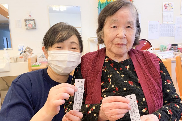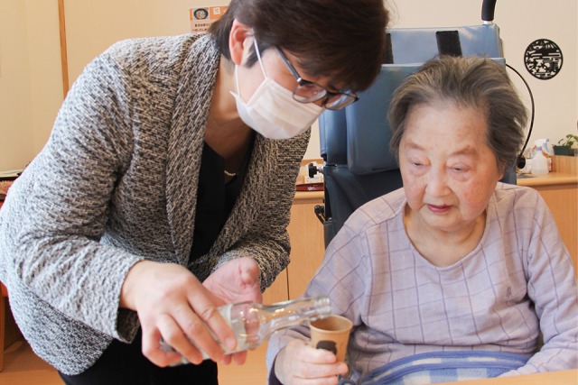 施設長から、「今年も皆さんが健康に過ごせるようにご支援させていただきます」と新年の挨拶をいただきました。その後ご利用者にお屠蘇が振る舞われました。