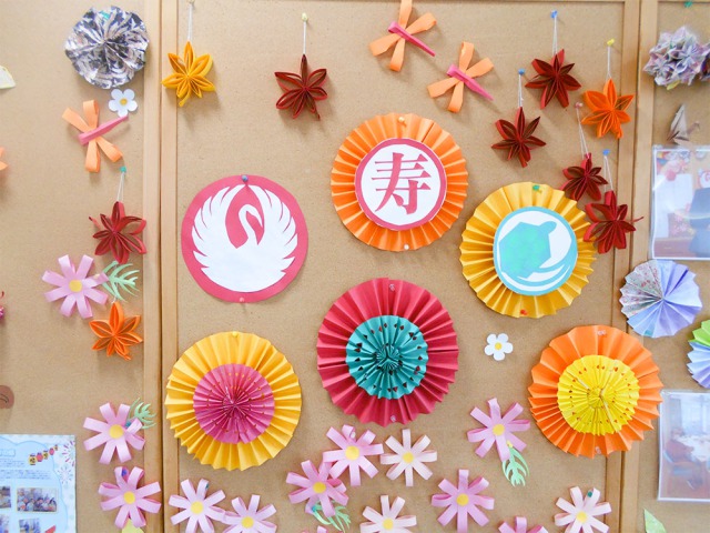 まずはホールの装飾です。こもれびの郷の「家庭的な雰囲気」が活かせるよう、ご利用者にも手伝ってもらい、手作りで温かみのある「鶴と亀のお祝い飾り」を作りました。