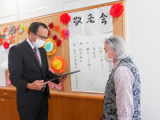 敬老会では、百寿1名、卒寿2名、米寿3名、喜寿1名の方々に感謝状を贈呈し、職員とご利用者の皆さんでご長寿のお祝いをしました。