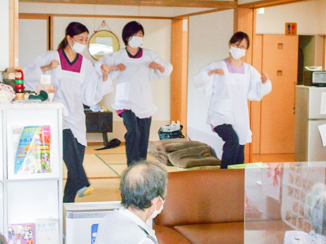 感謝状贈呈後は、職員の余興です。ご利用者の皆さんに、いつまでも元気でいて欲しい、楽しく見てもらうにはどうしたらいいのか考えました。