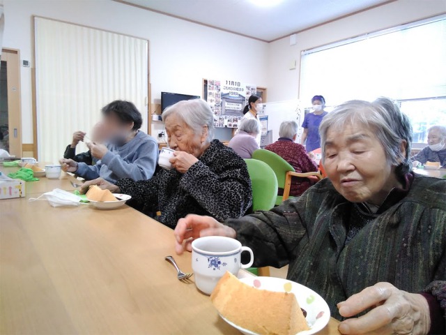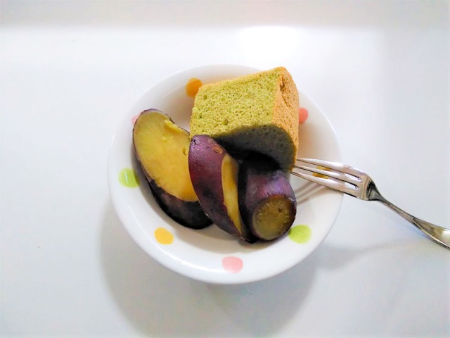 おやつの時間には、今年こもれびの郷浜中で収穫した「さつまいも」を甘煮にし、シフォンケーキに添えて、召し上がっていただきました。