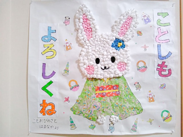 今年初の作品は、いつも散歩中に立ち寄ってくださる浜中保育園の皆さんへのプレゼントです。「うさぎ年」にちなんだ壁飾りを作成しました。