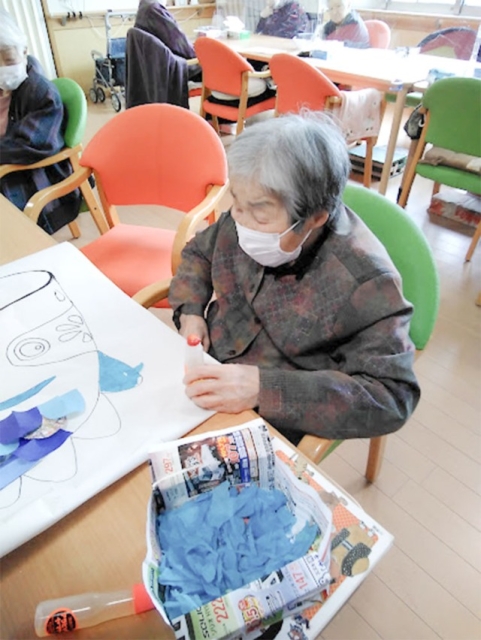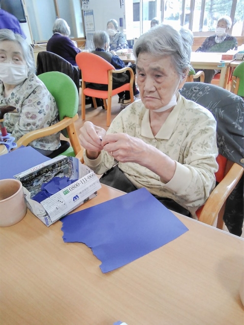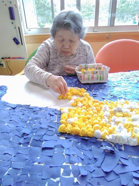 夜空は青の折り紙で表現、ご利用者の皆さんにはとてもたくさんの折り紙をちぎってもらいました。「指の運動にもなっていいの」と皆さん積極的に引き受けてくださいました。