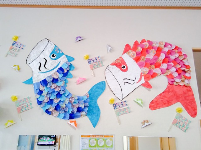 5月といえば「こどもの日」ということで、赤と青のこいのぼりを作成しました。