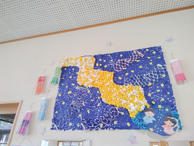 庄内地方の七夕は時期的にまだ梅雨が明けず、ここ数年天気に恵まれていませんでしたが、皆さんと作成した天の川で季節を感じていただくことができました。