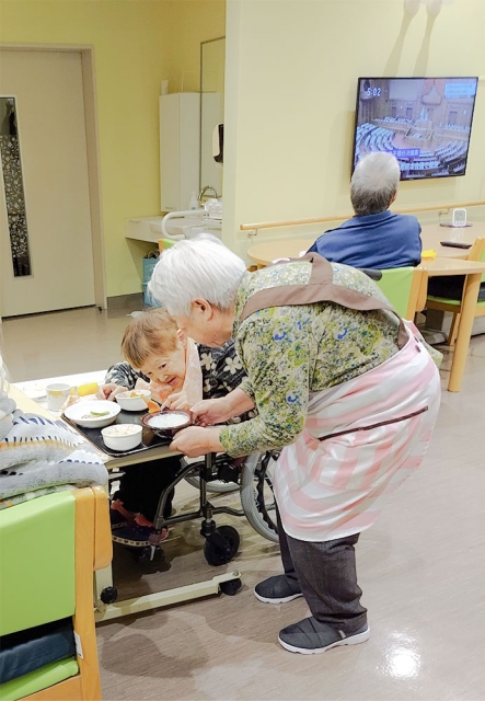 「ご飯来たよ~、前いいが?ごめんの~」「ありがとう~」エプロンを付けて、職員と一緒に配膳です。